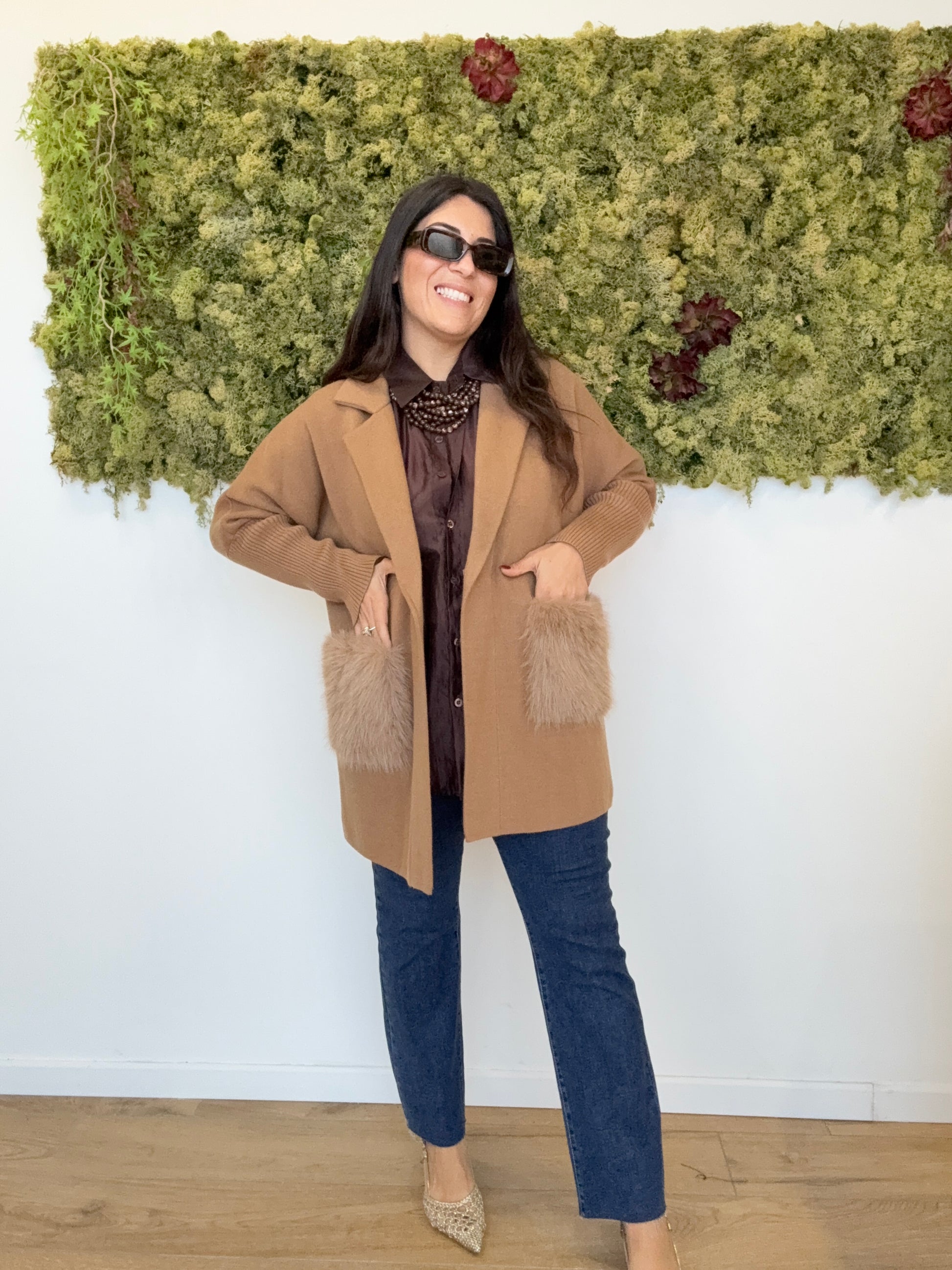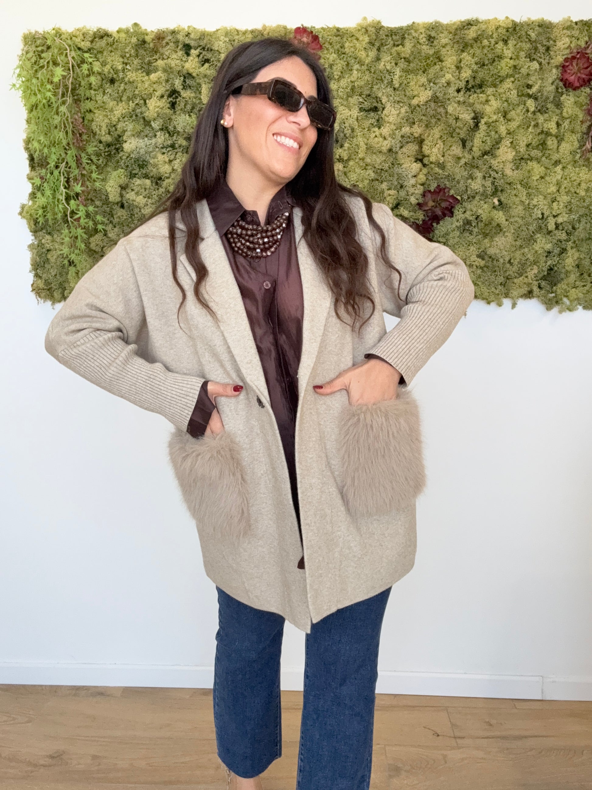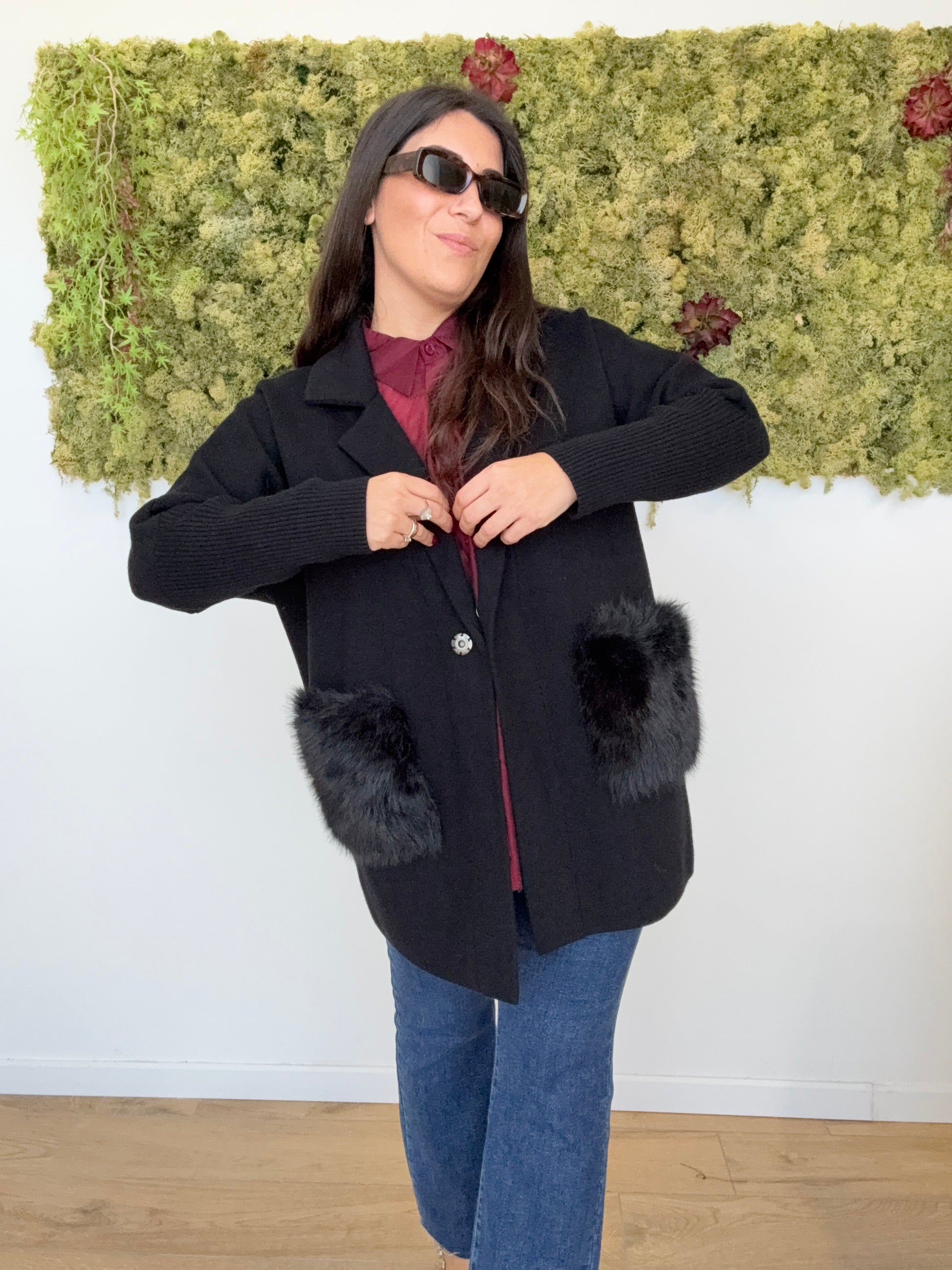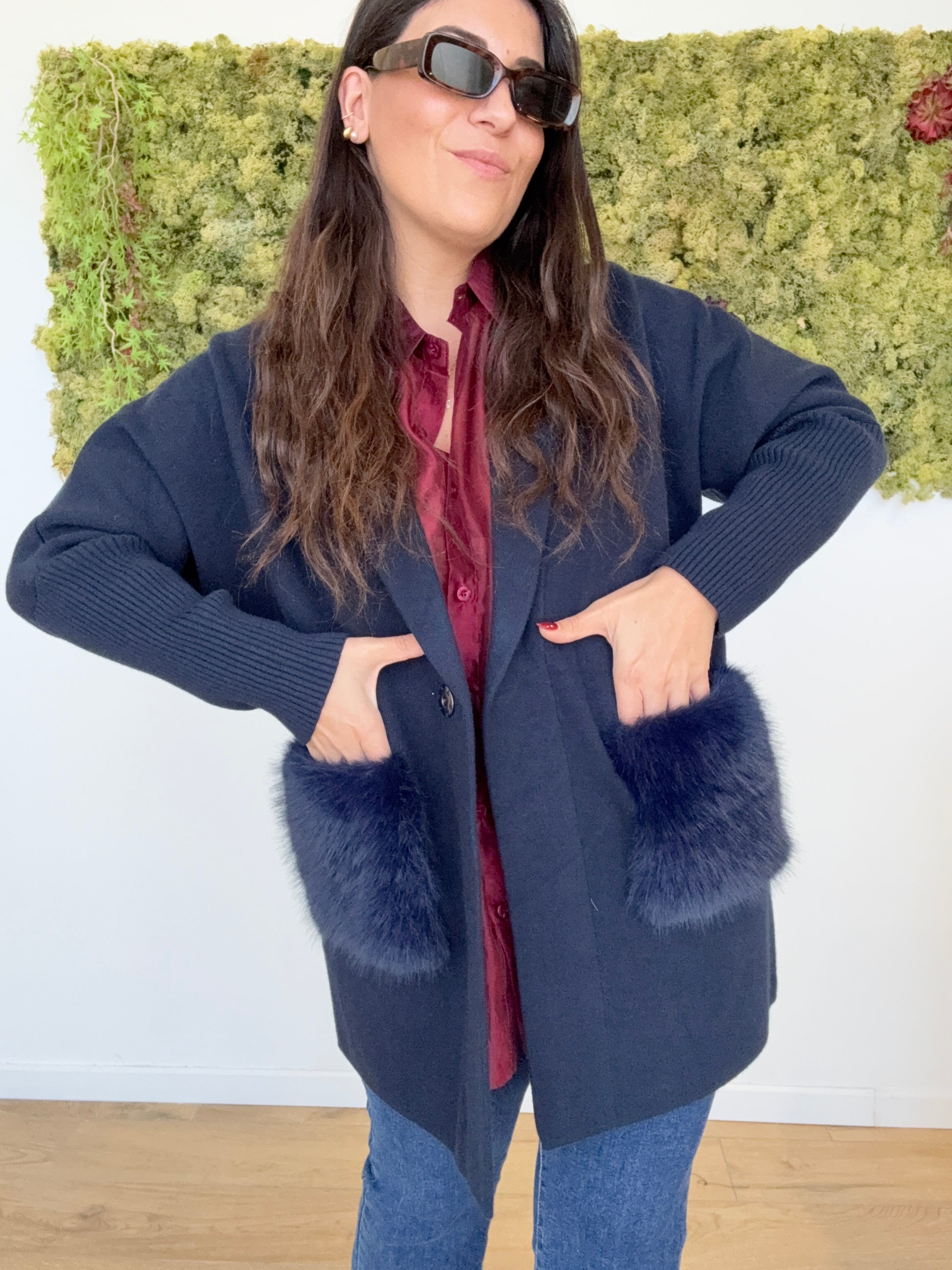 Cappottino maglia giacca con tasche ecopelliccia