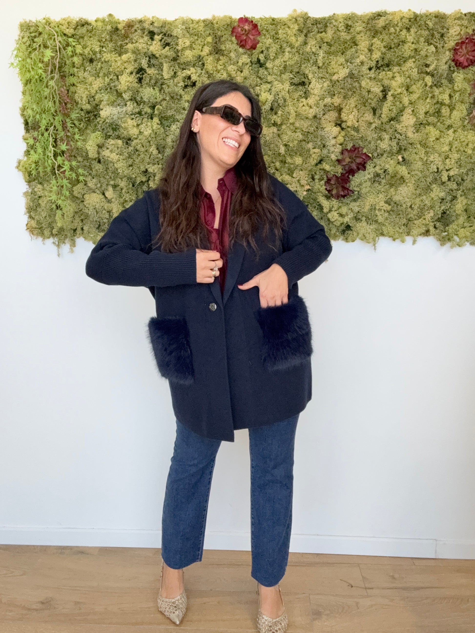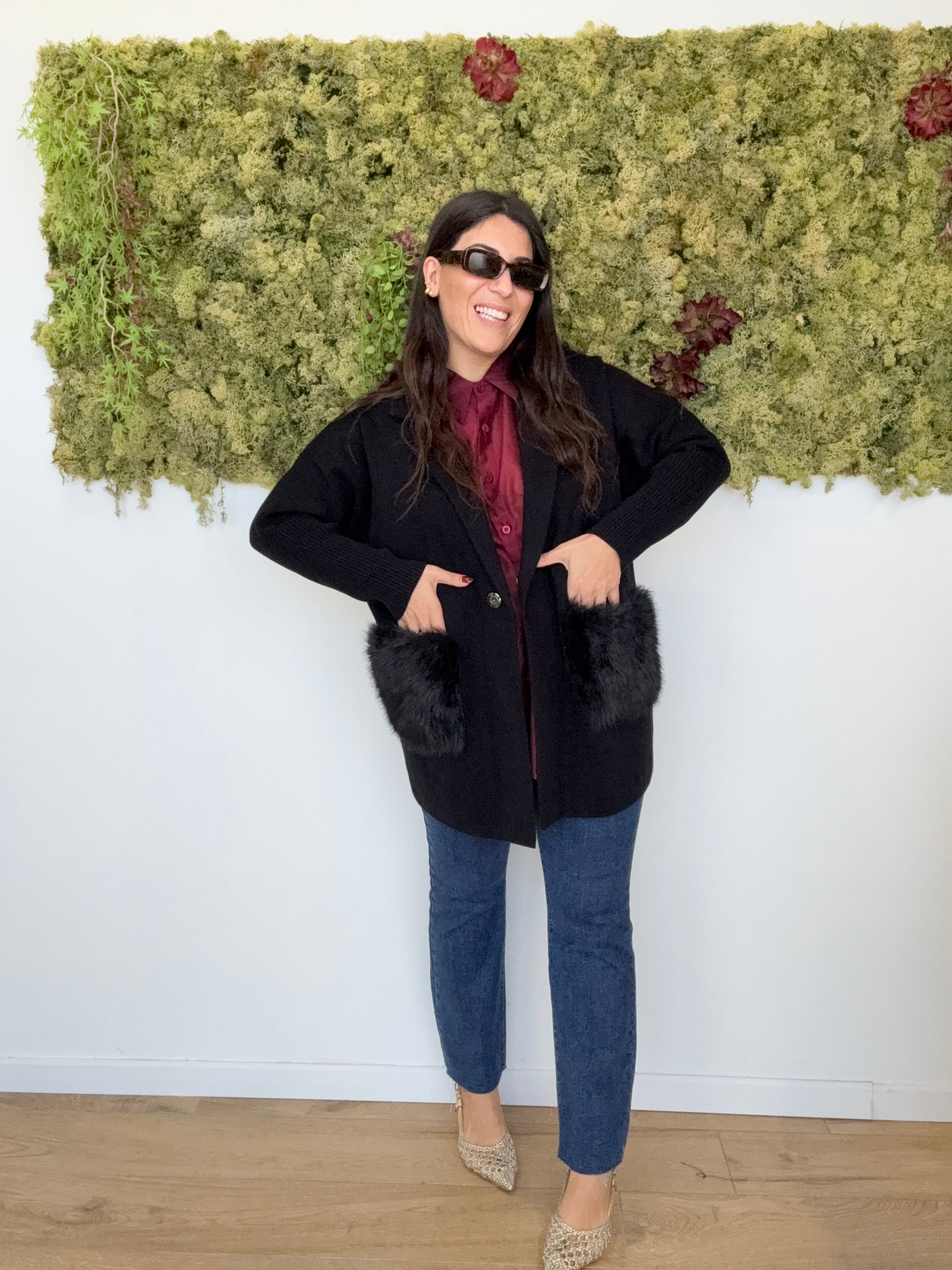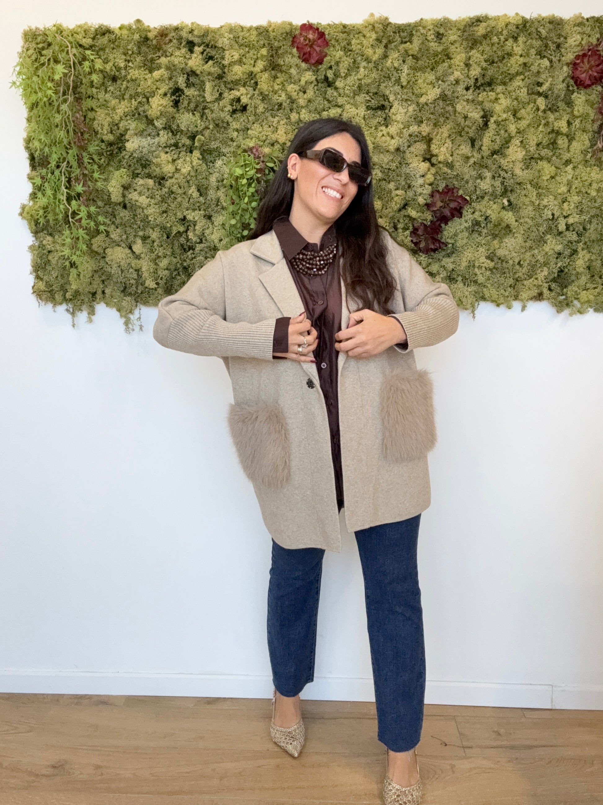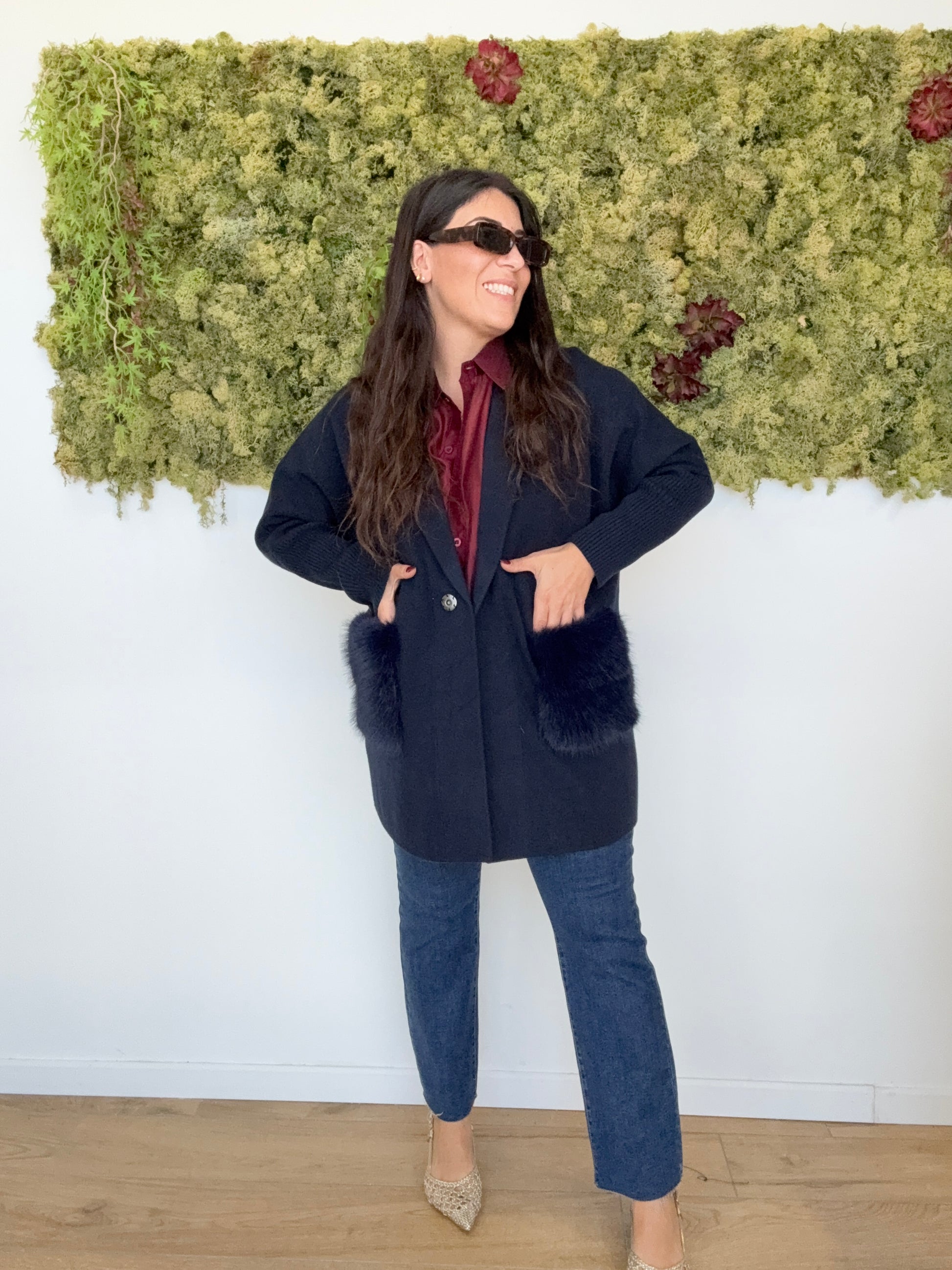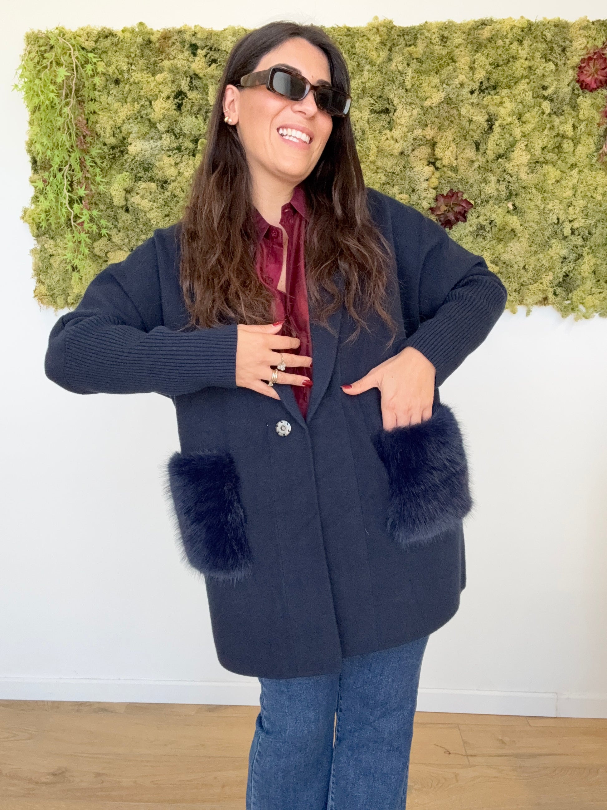 Cappottino maglia giacca con tasche ecopelliccia