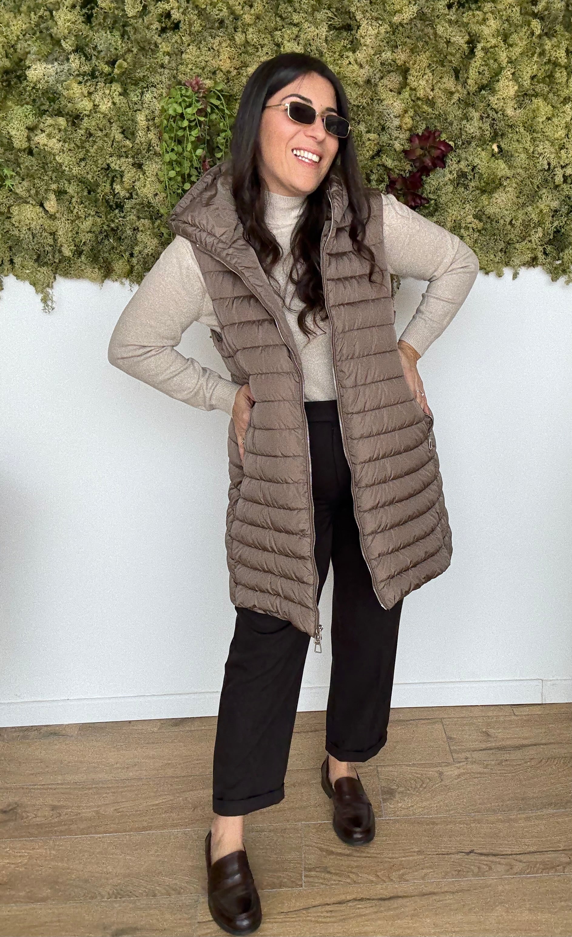 Cappotto composto da Gilet trapuntato con cappuccio, tasche e maniche che richiamano il tessuto del Gilet. Indossabile anche senza Gilet per un look meno casual