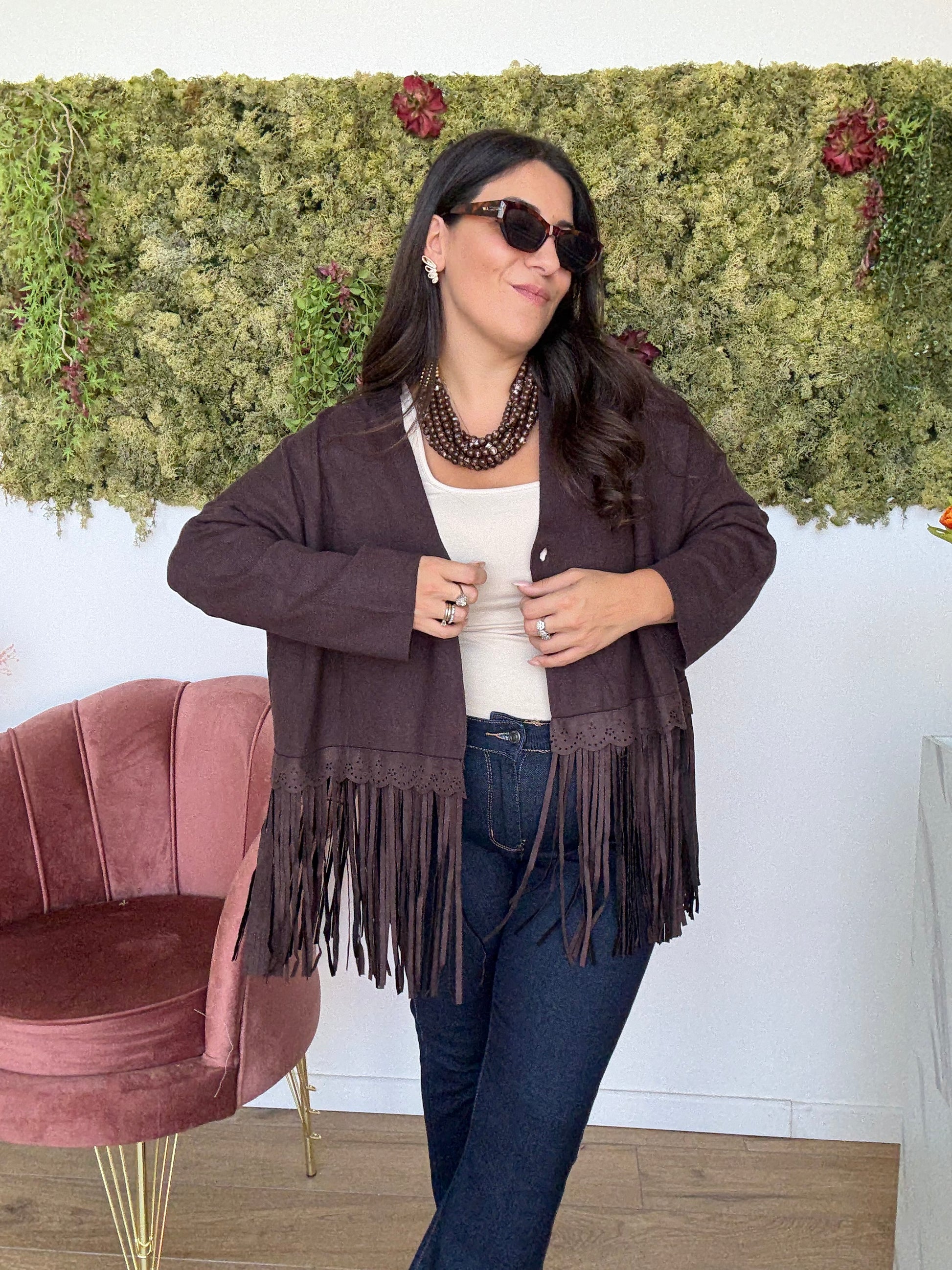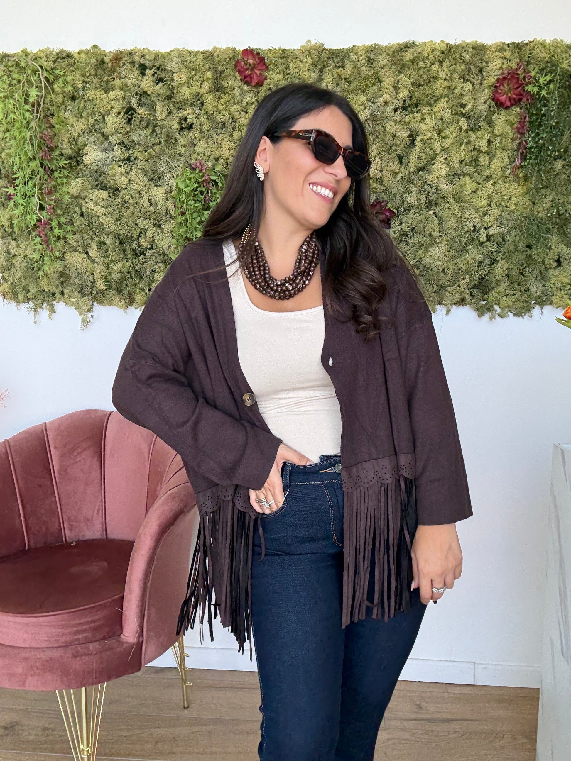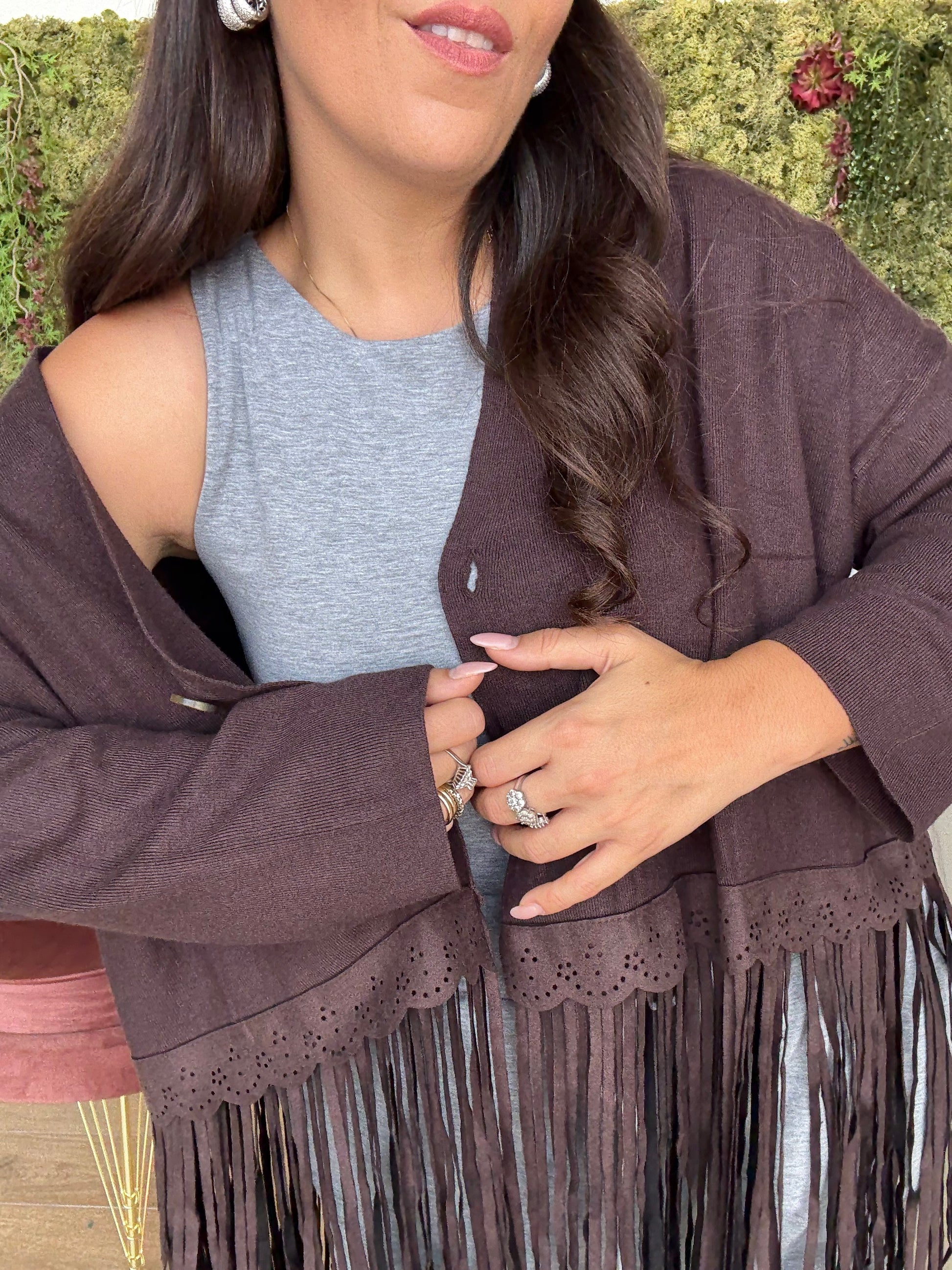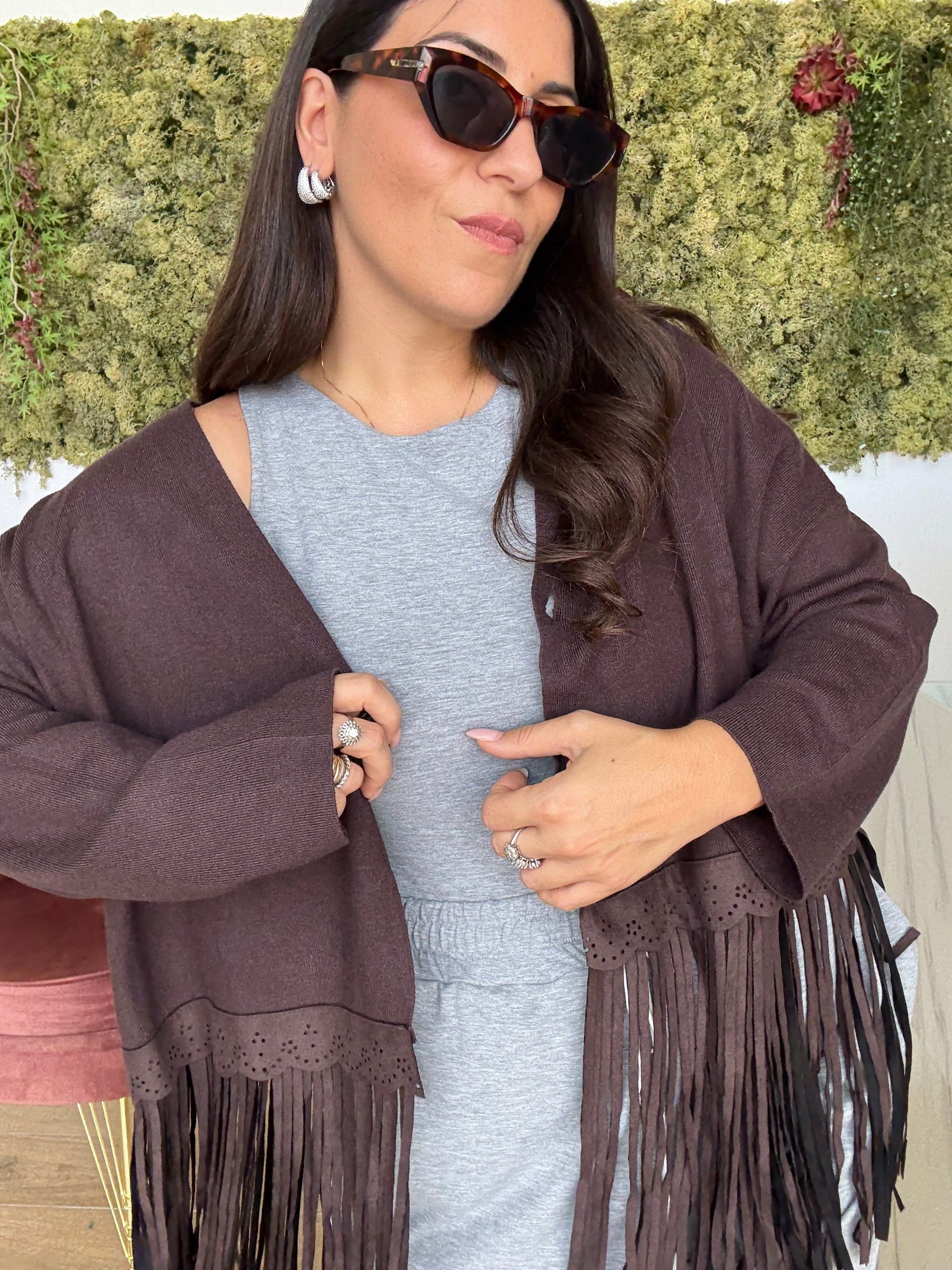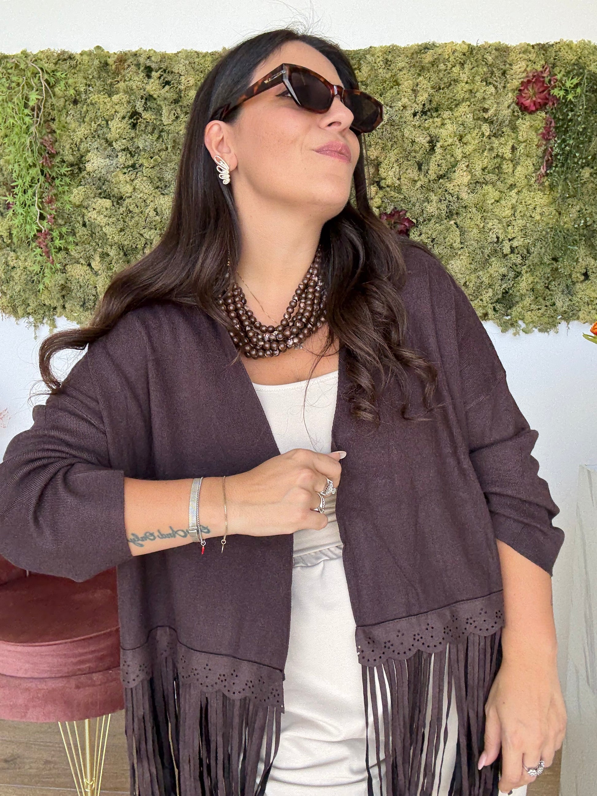Cardigan over in maglia calda con bottone centrale e frange davanti e dietro