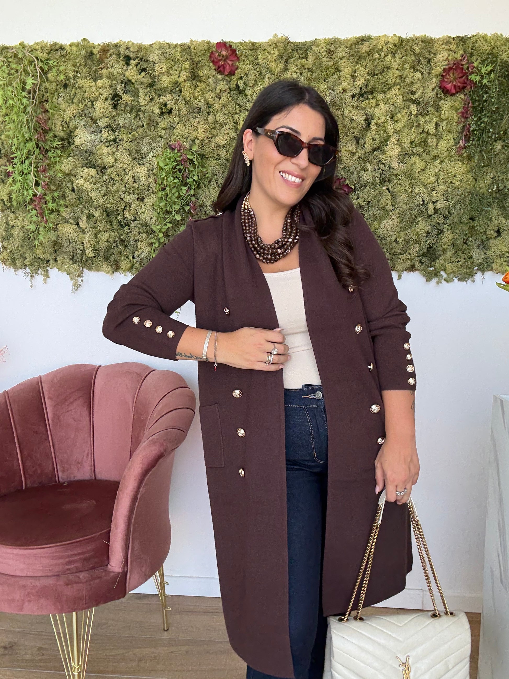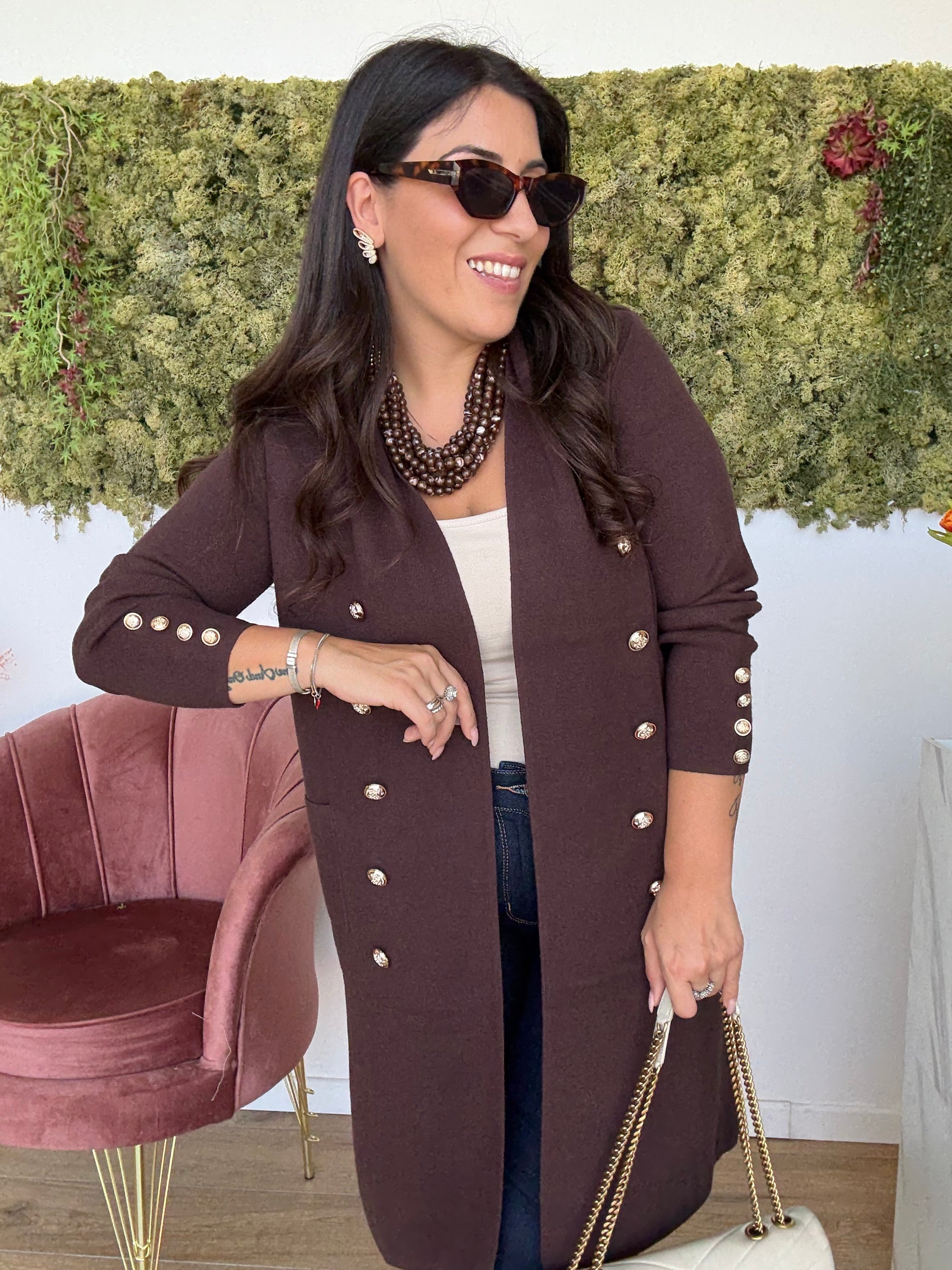 Cardigan lungo in maglia calda con bottoni oro