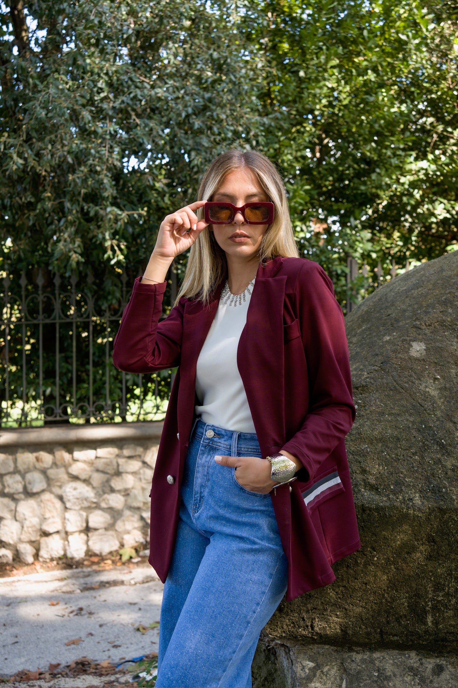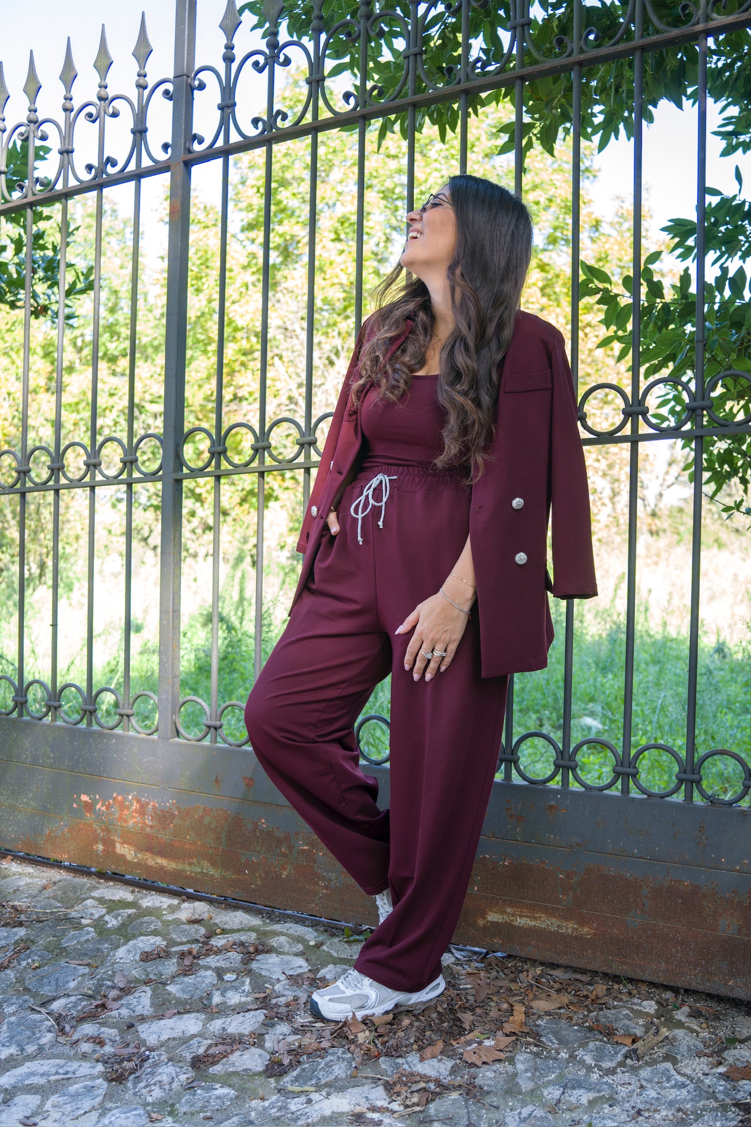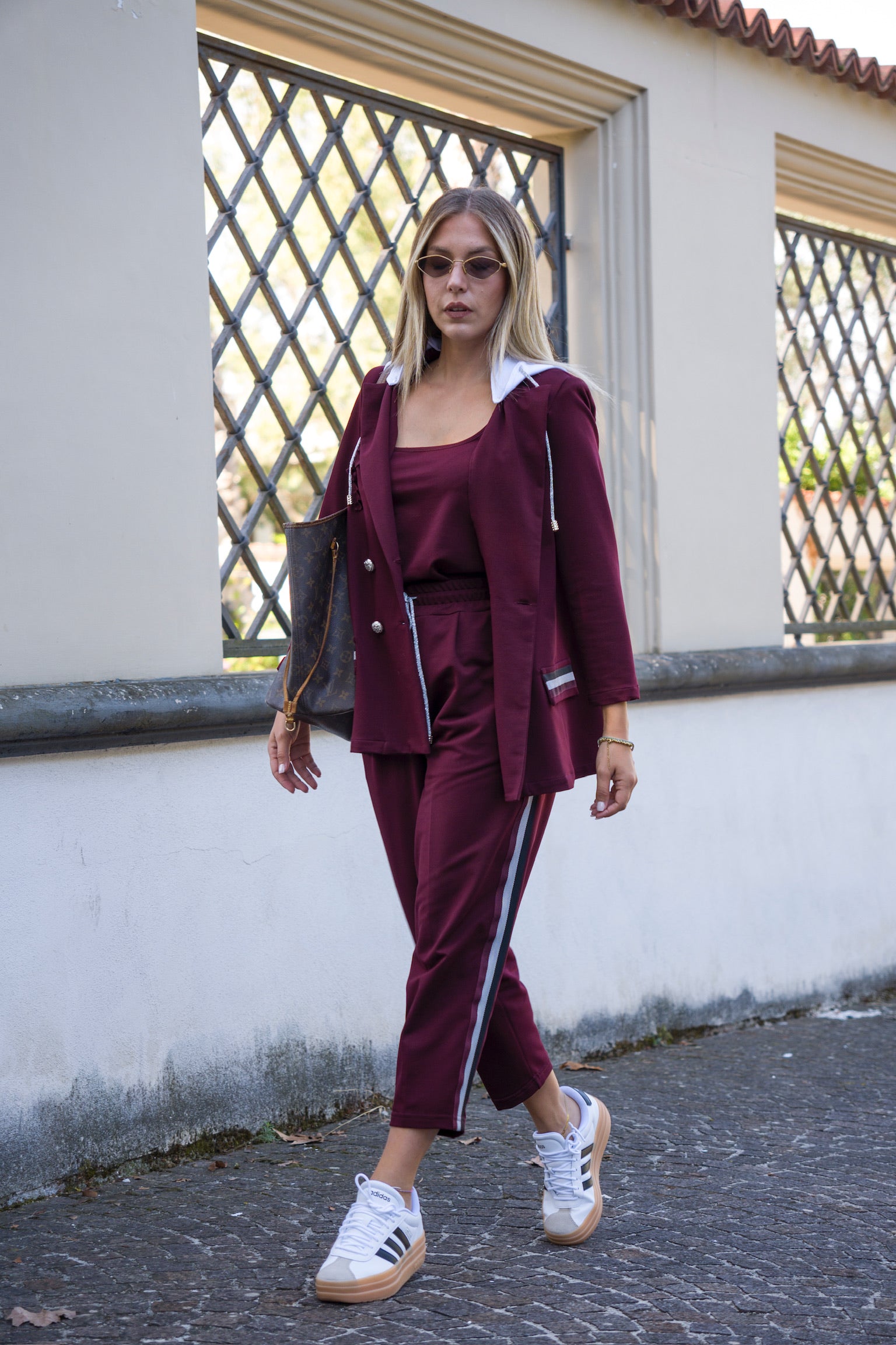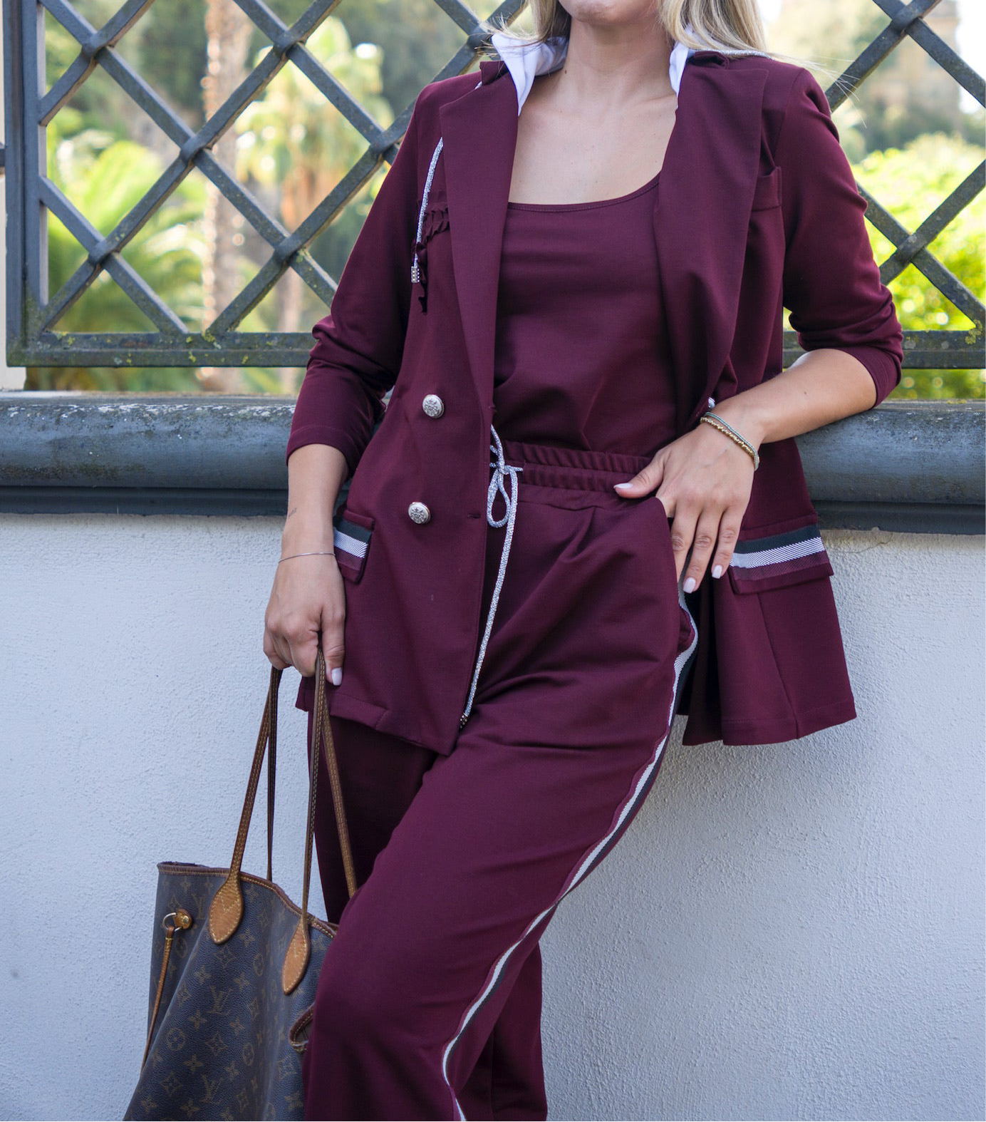Giacca doppio petto in cotone felpa, tasche con applicazione in gros grain abbinato al pantalone, e bottoni argento in abbinamento al cordoncino lurex del cappuccio.