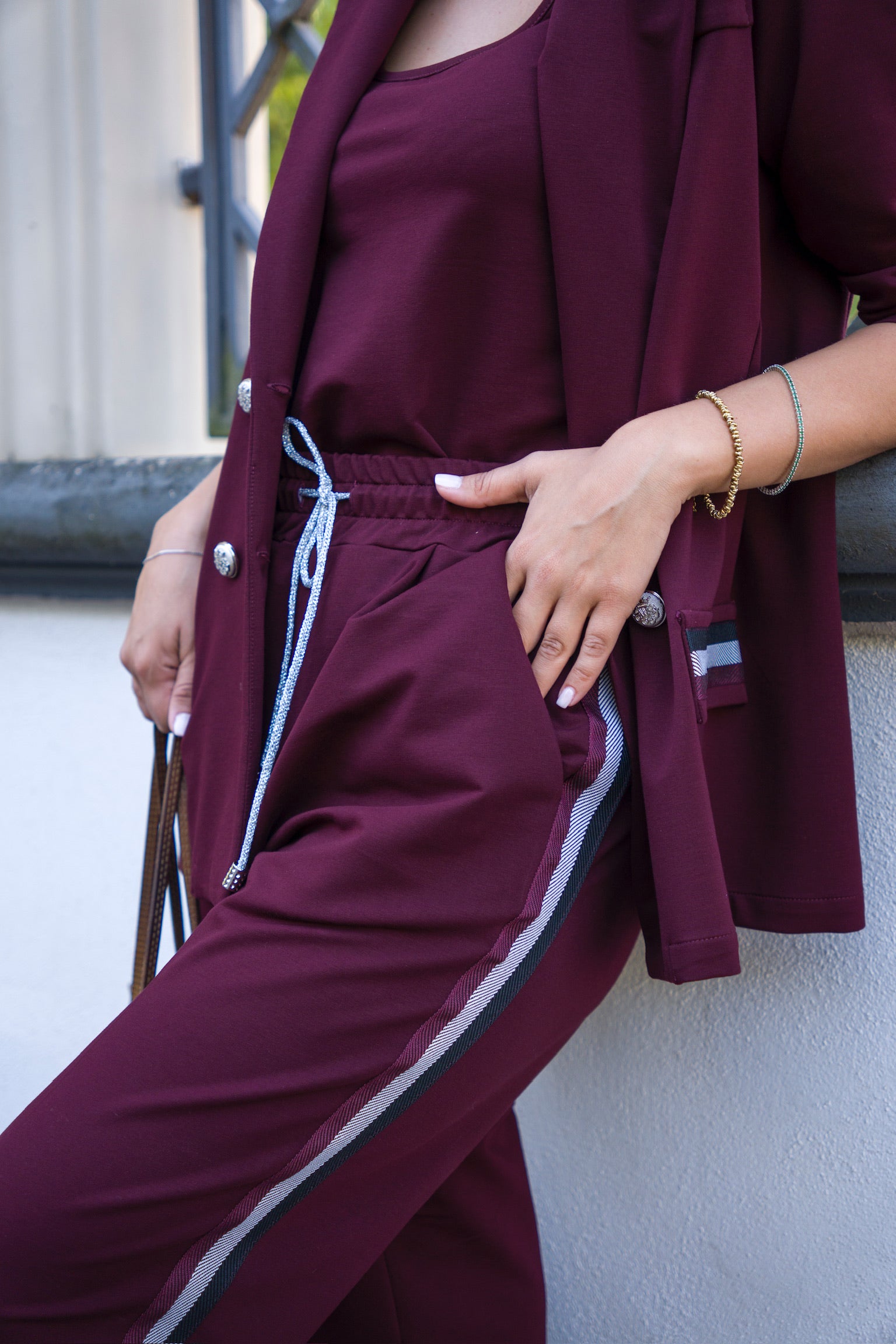 Pantalone Sigaretta con pence alla caviglia in cotone felpa con elastico in vita e coulisse in lurex per poter regolare il bustino. Applicazione in gros grain nei lati del pantalone.