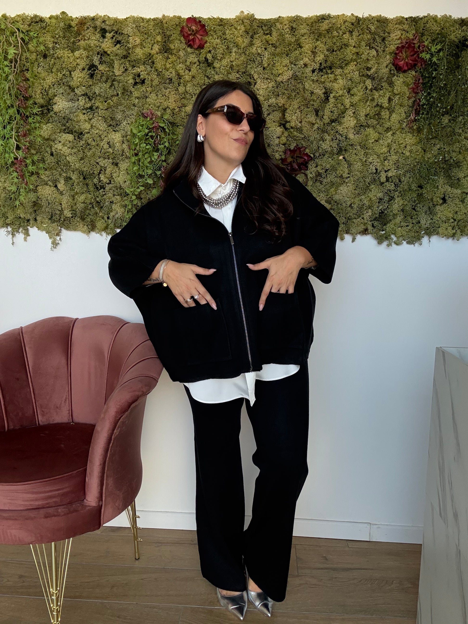 Pantalone in maglia calda abbinato al cardigan zip (stesso tessuto)