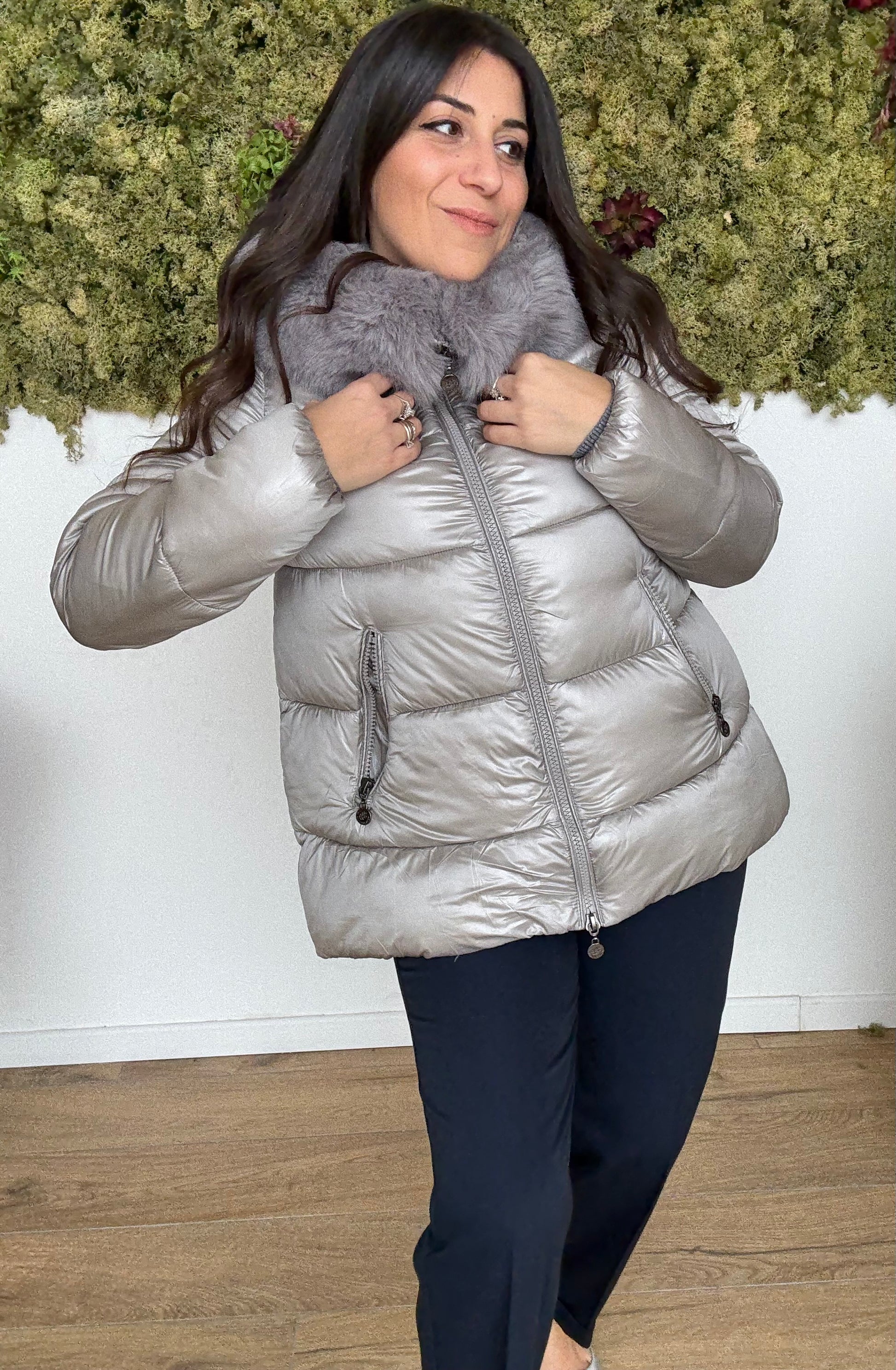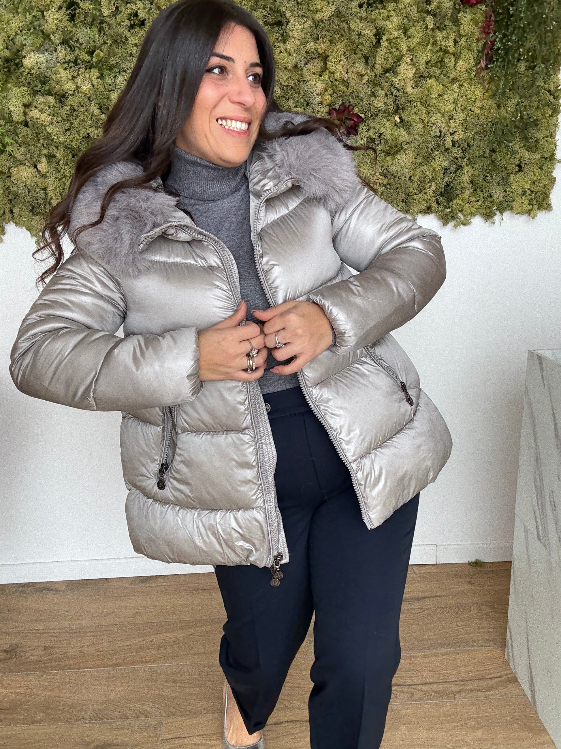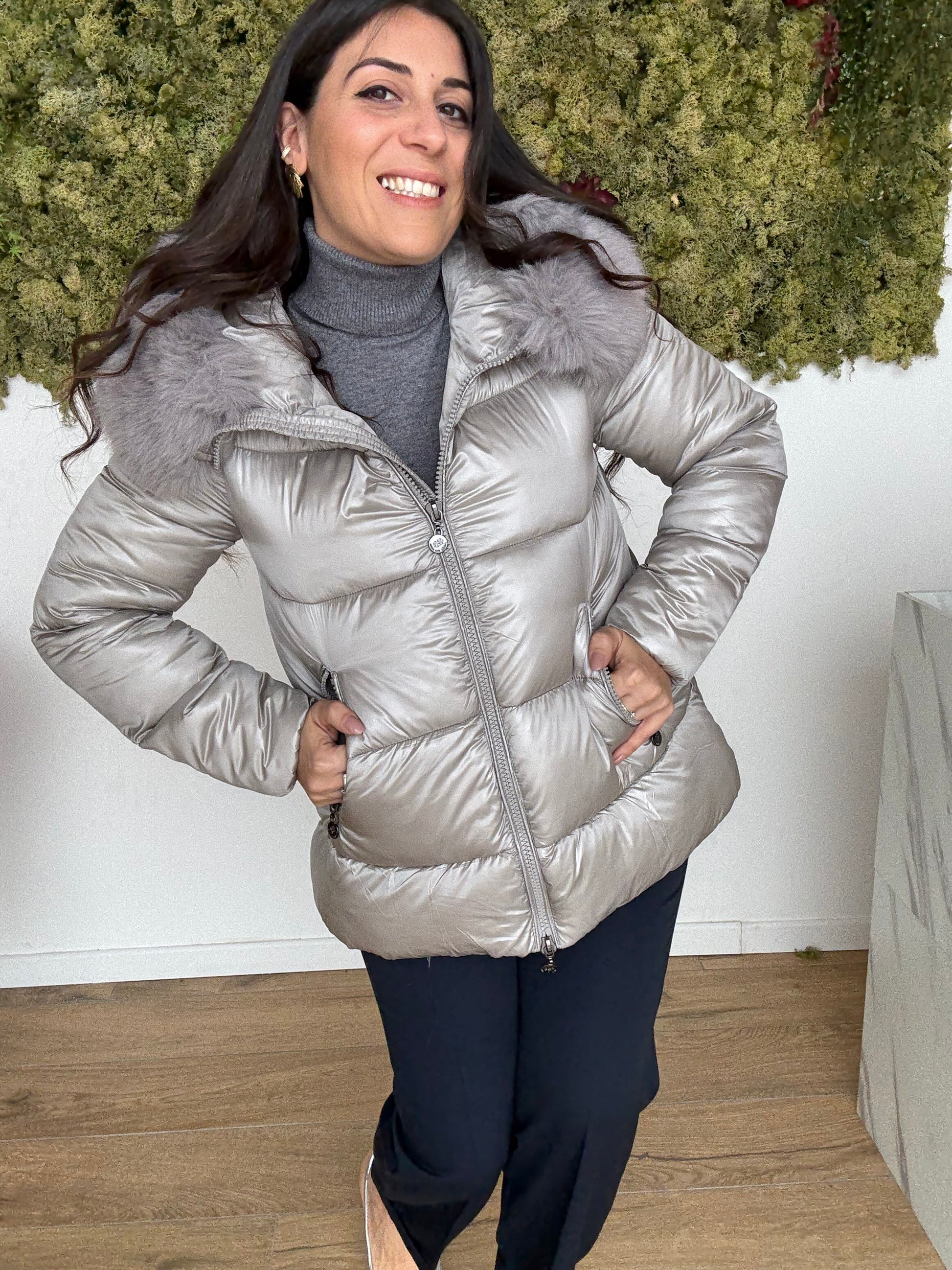 Piumino corto con cappuccio e pelliccia taglia fino alla XXL