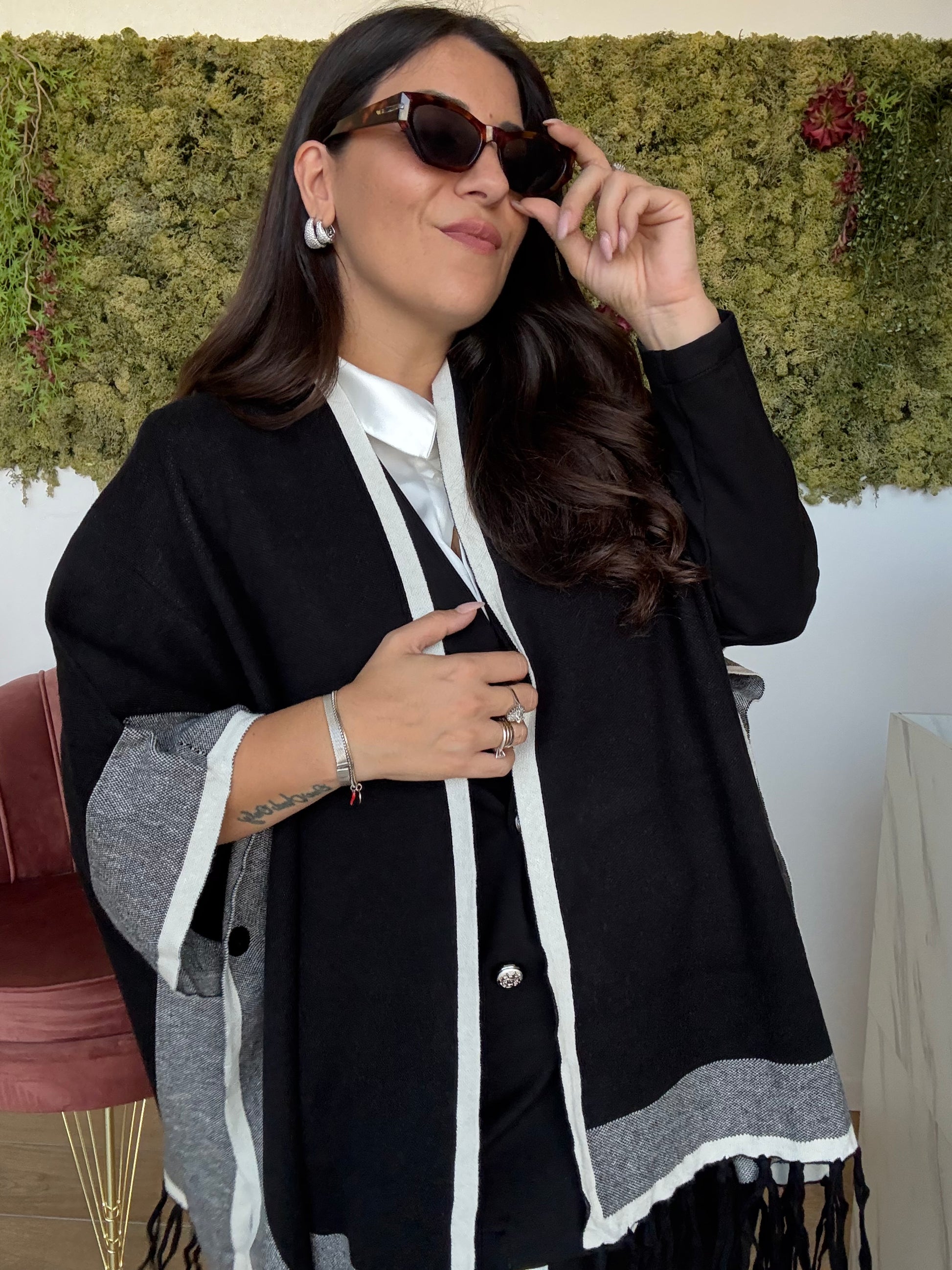 Poncho Cardigan lungo in maglia calda con bottoni e frange