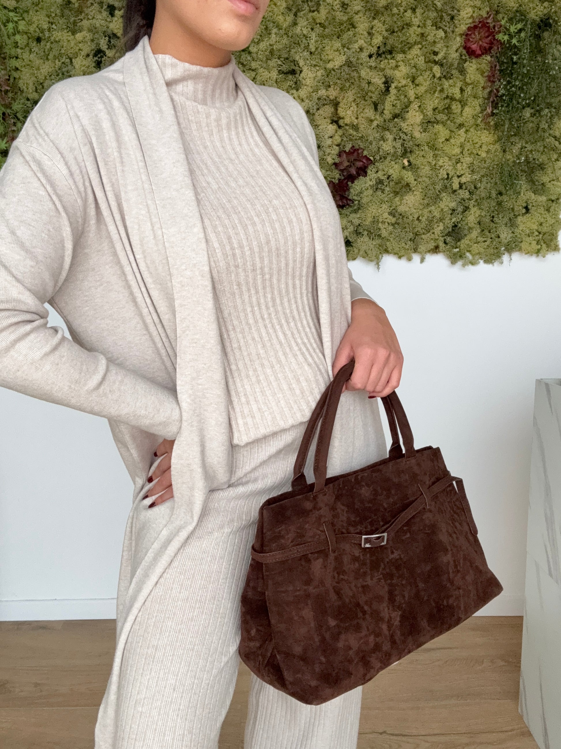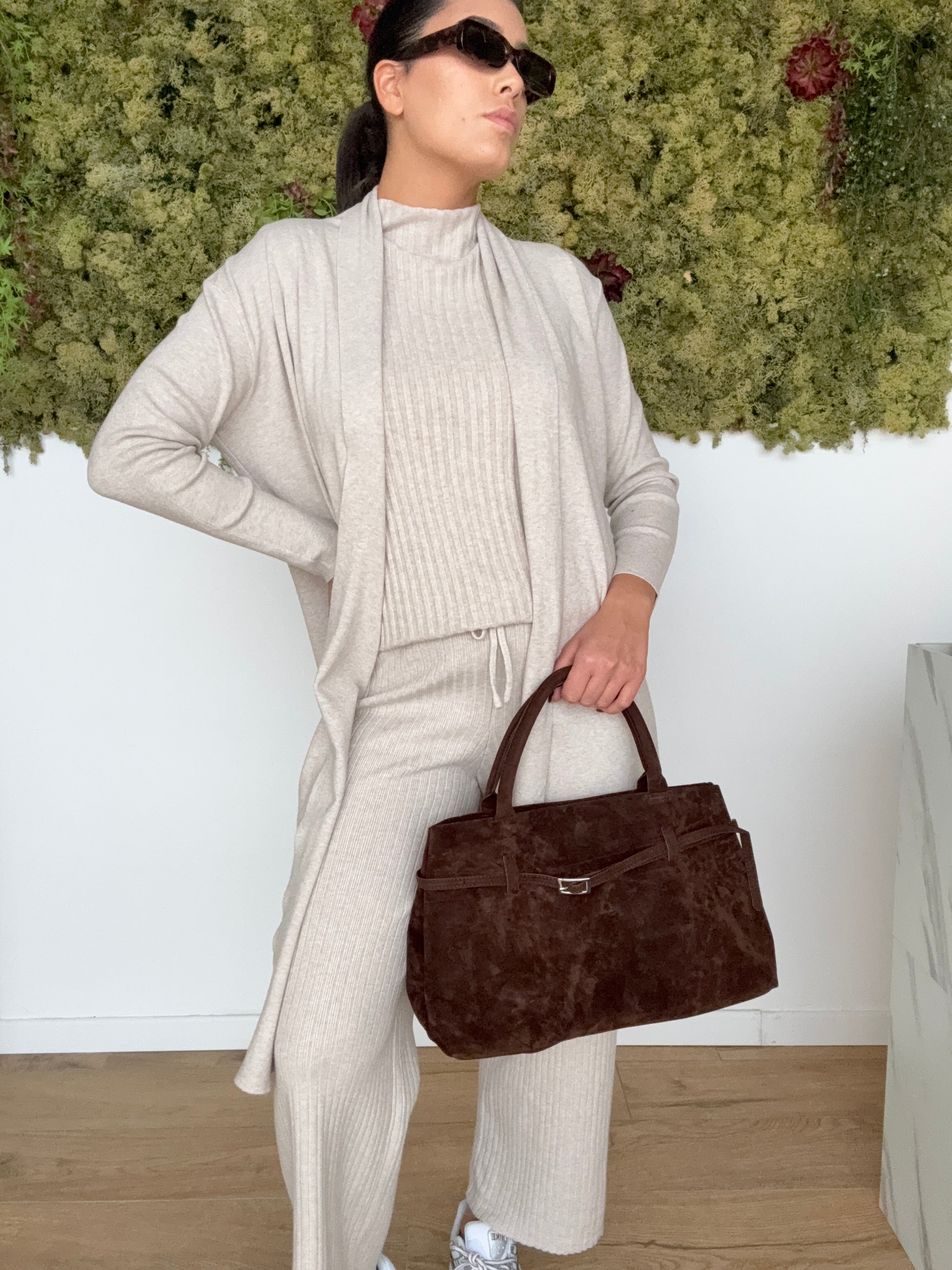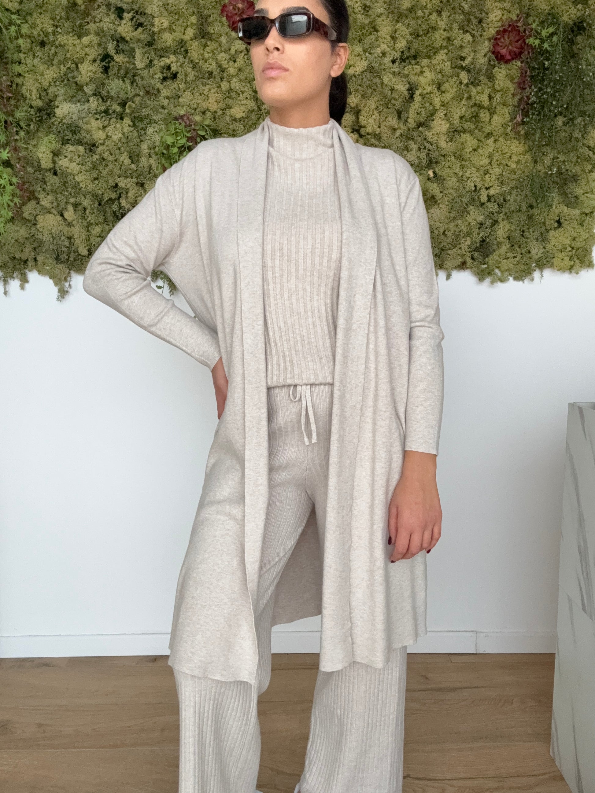Set coordinato 3 pezzi in viscosa calda con sottogiacca mezzo collo e pantalone in costina,cardigan lungo slim in viscosa pettinata