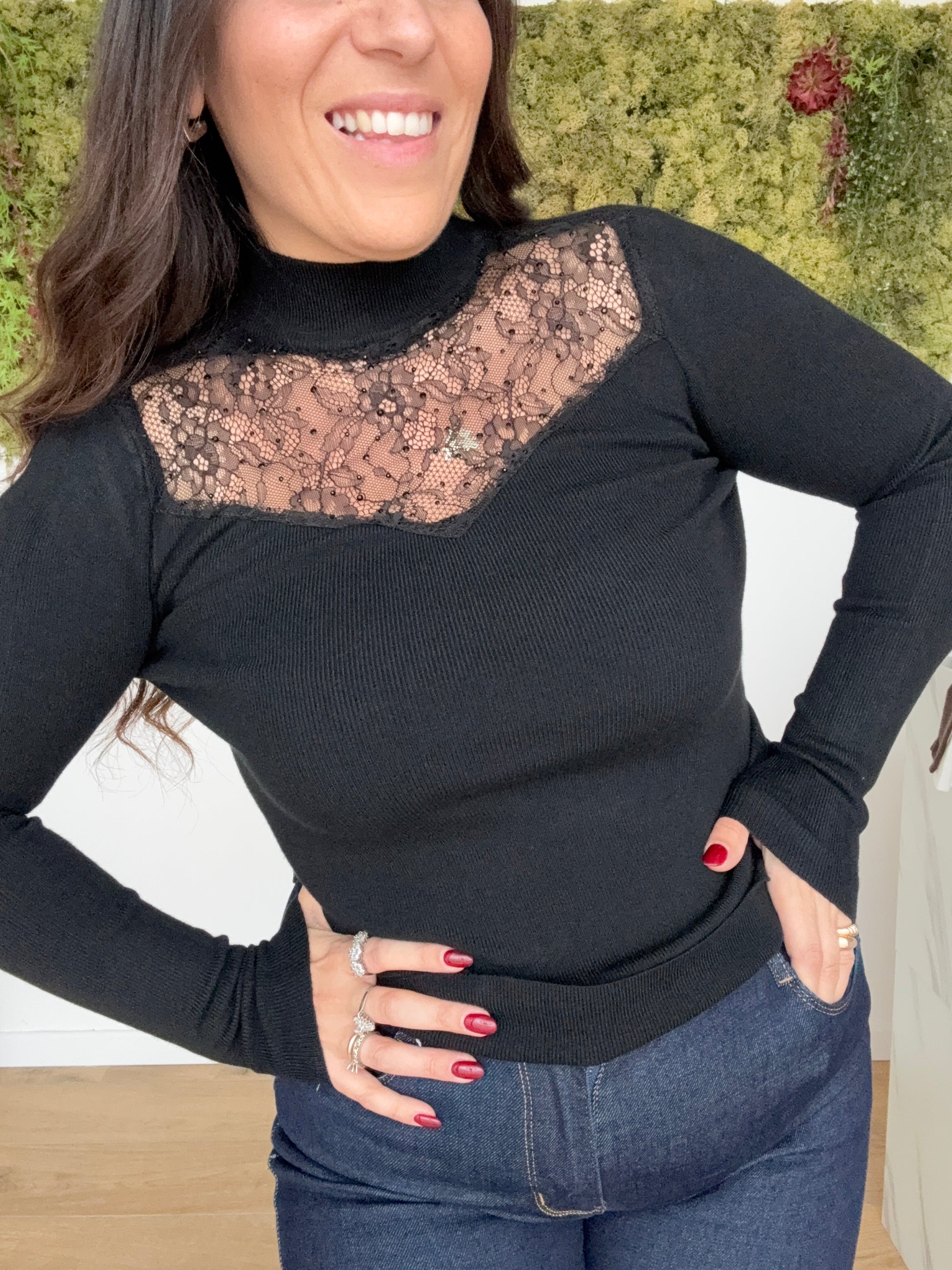 Sottogiacca in maglia colmo costina e inserto pizzo e strass